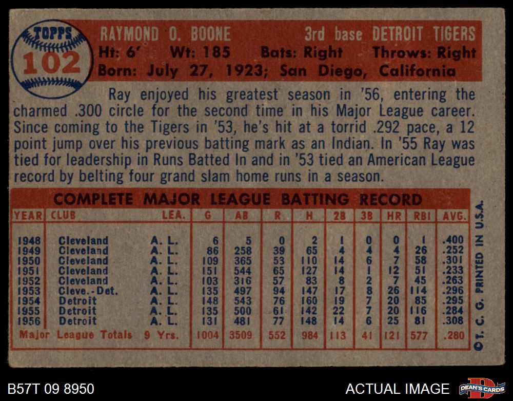 1957 Topps #102 Ray Boone 3 - VG