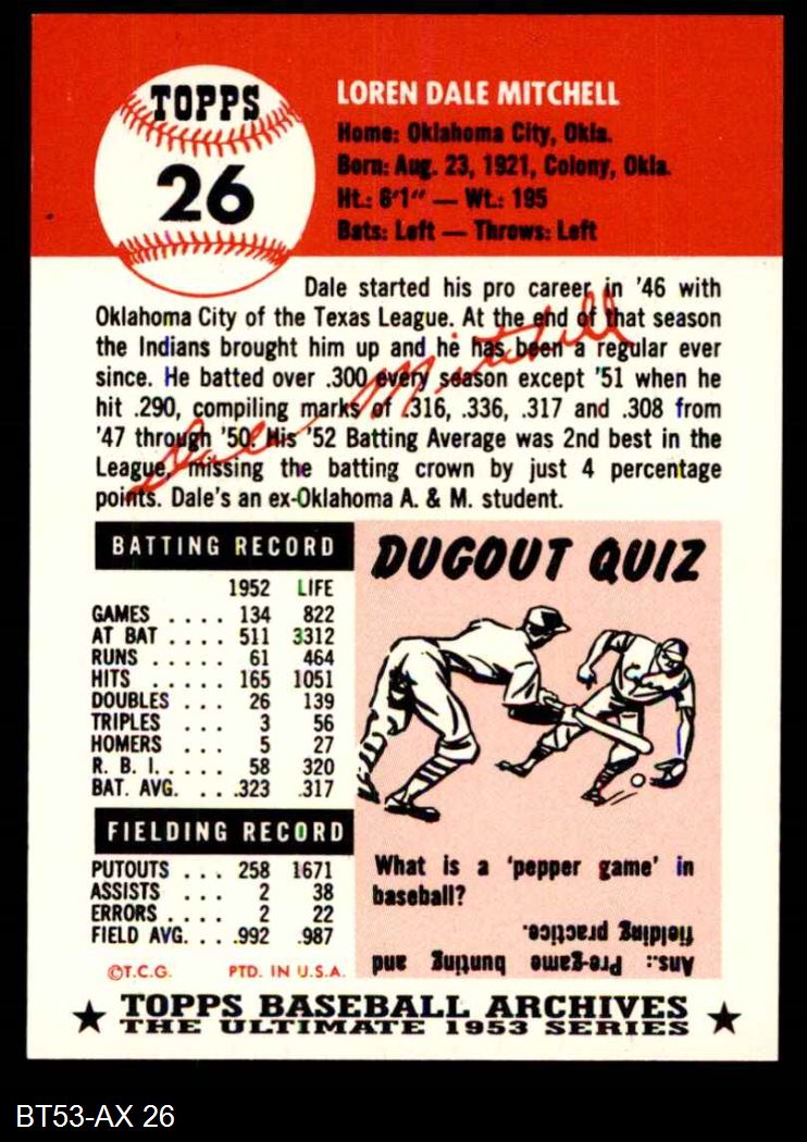 1953 Topps Archives #26 Dale Mitchell 8 - NM/MT