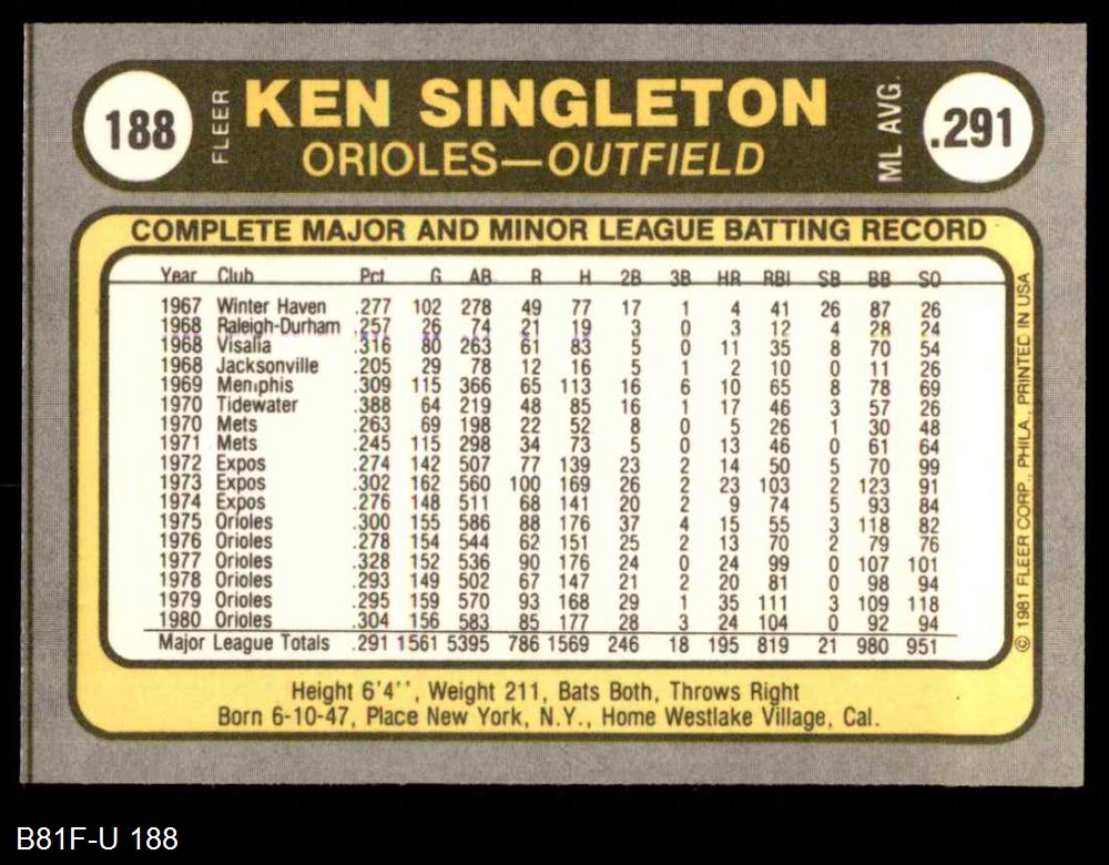 1981 Fleer #188 Ken Singleton 8 - NM/MT