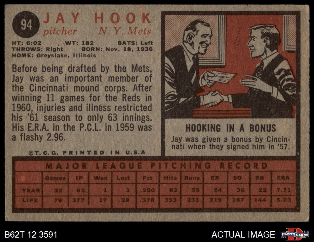 1962 Topps #94 Jay Hook 2.5 - GD+