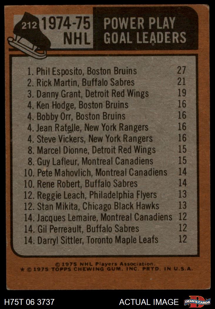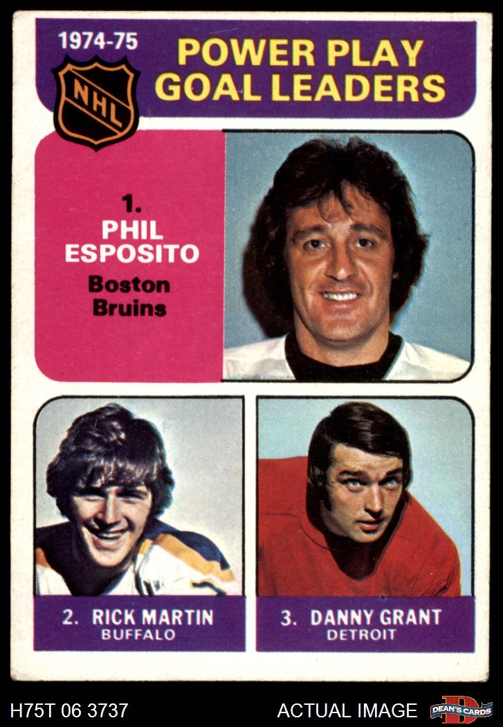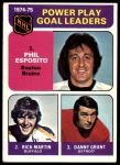 1975 Topps #212 - Phil Esposito / Rick Martin / Danny Grant Power Play Goal Leaders 3 - VG