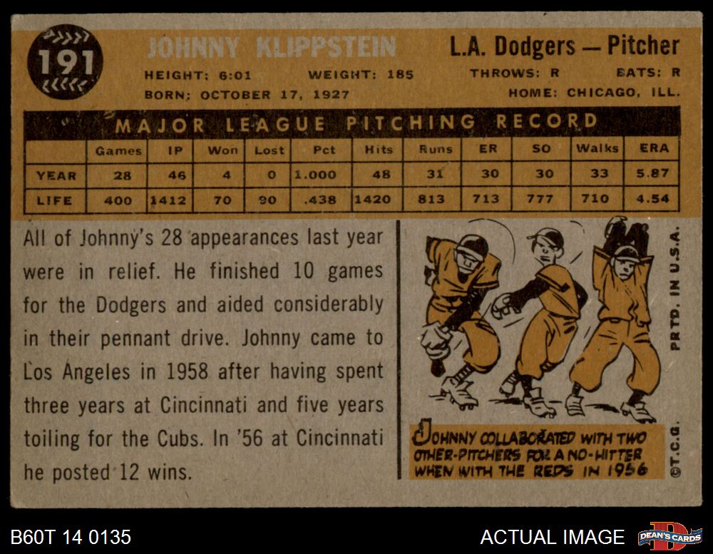 1960 Topps #191 Johnny Klippstein 2 - GOOD