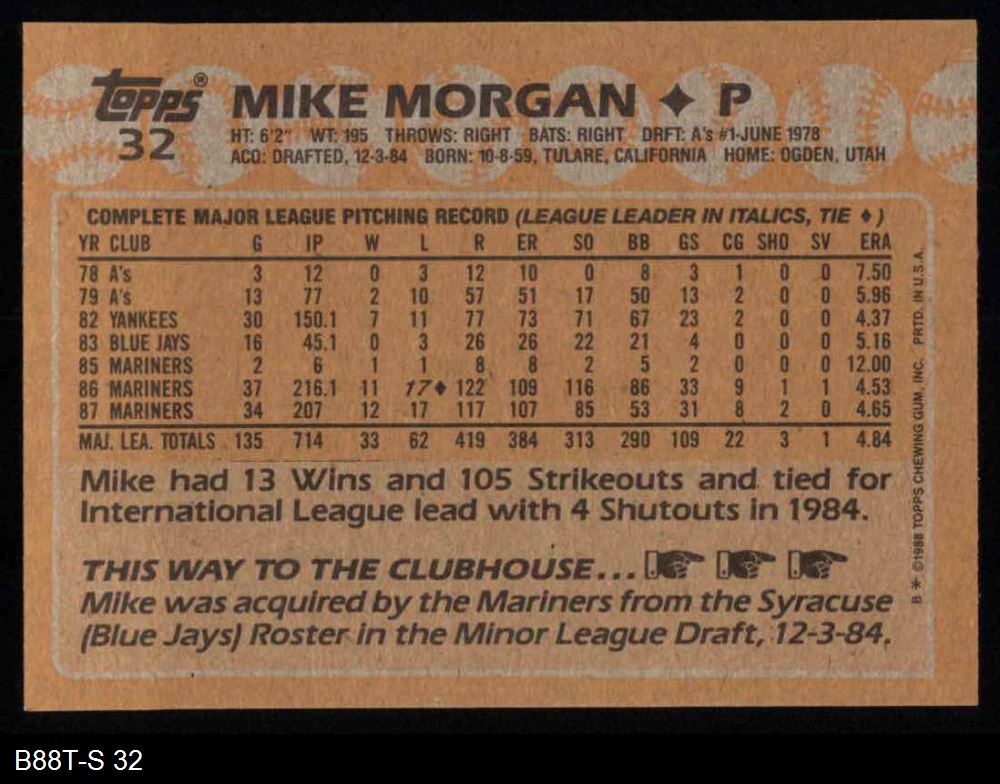 1988 Topps #32 Mike Morgan 8 - NM/MT