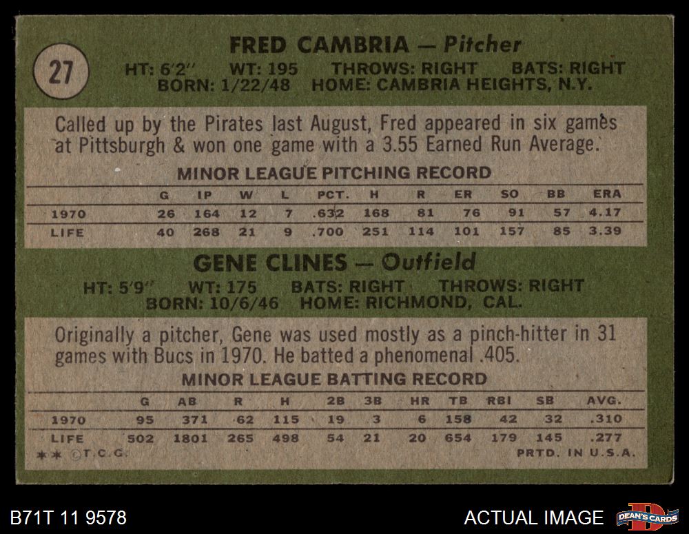 1971 Topps #27 - Gene Clines / Fred Cambria Pirates Rookies 4 - VG/EX