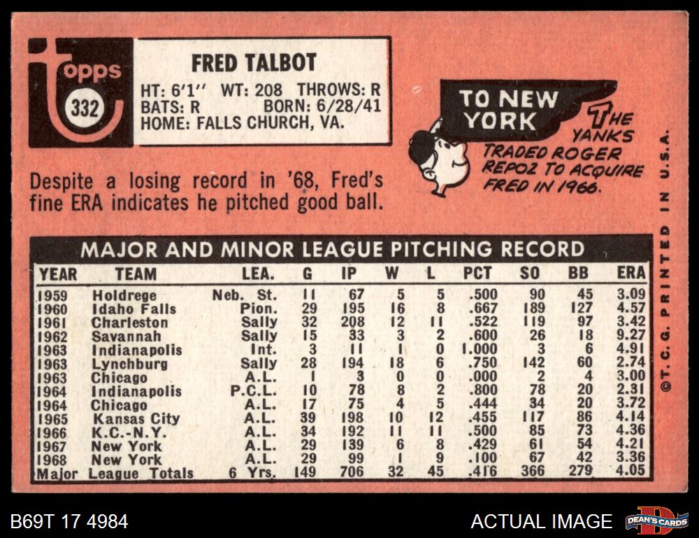1969 Topps #332 Fred Talbot 4 - VG/EX