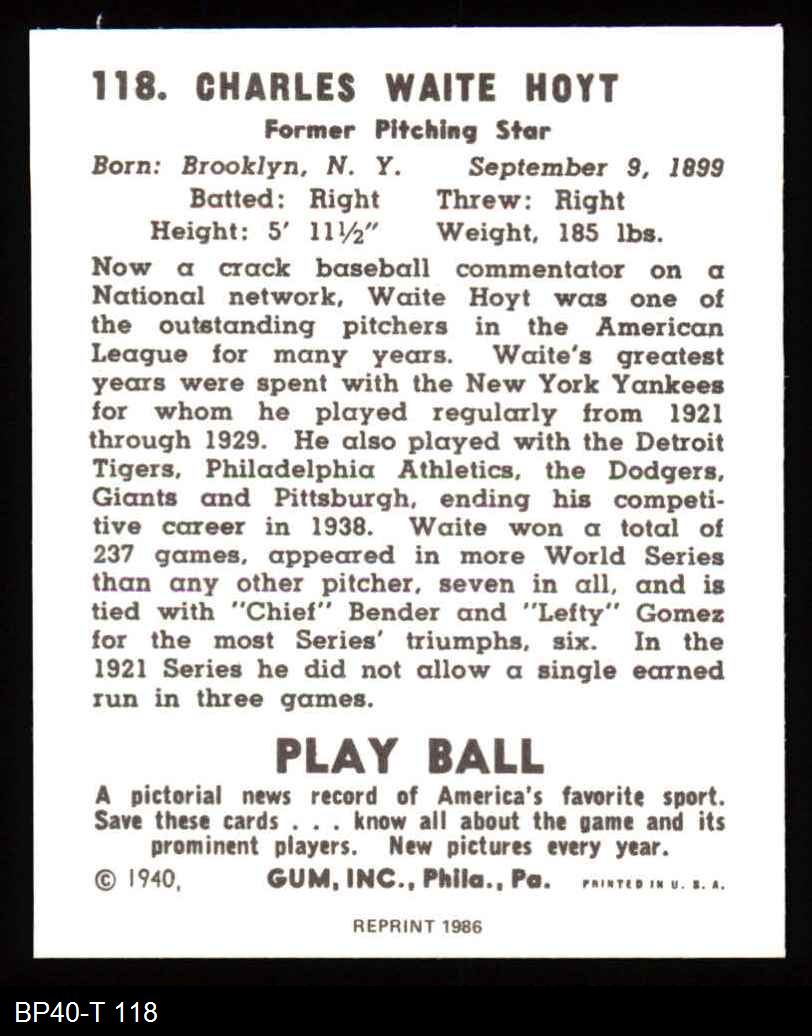 1940 Play Ball Reprint #118 Waite Hoyt 8 - NM/MT