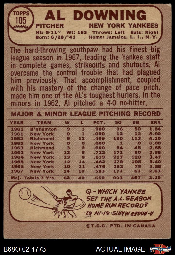 1968 O-Pee-Chee #105 Al Downing 4 - VG/EX