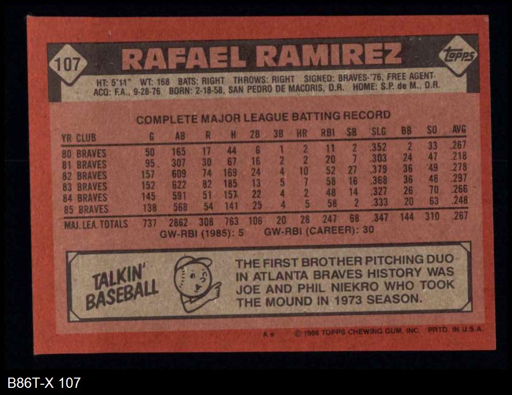 1986 Topps #107 Rafael Ramirez 8 - NM/MT