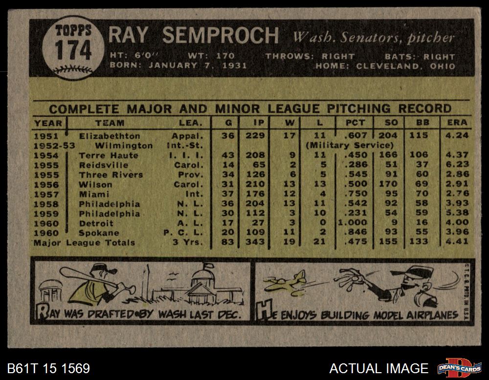 1961 Topps #174 Ray Semproch 4 - VG/EX
