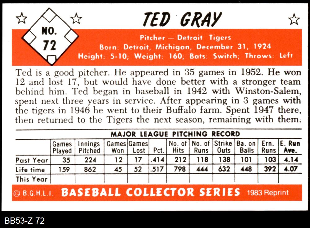 1953 Bowman REPRINT #72 Ted Gray 8 - NM/MT