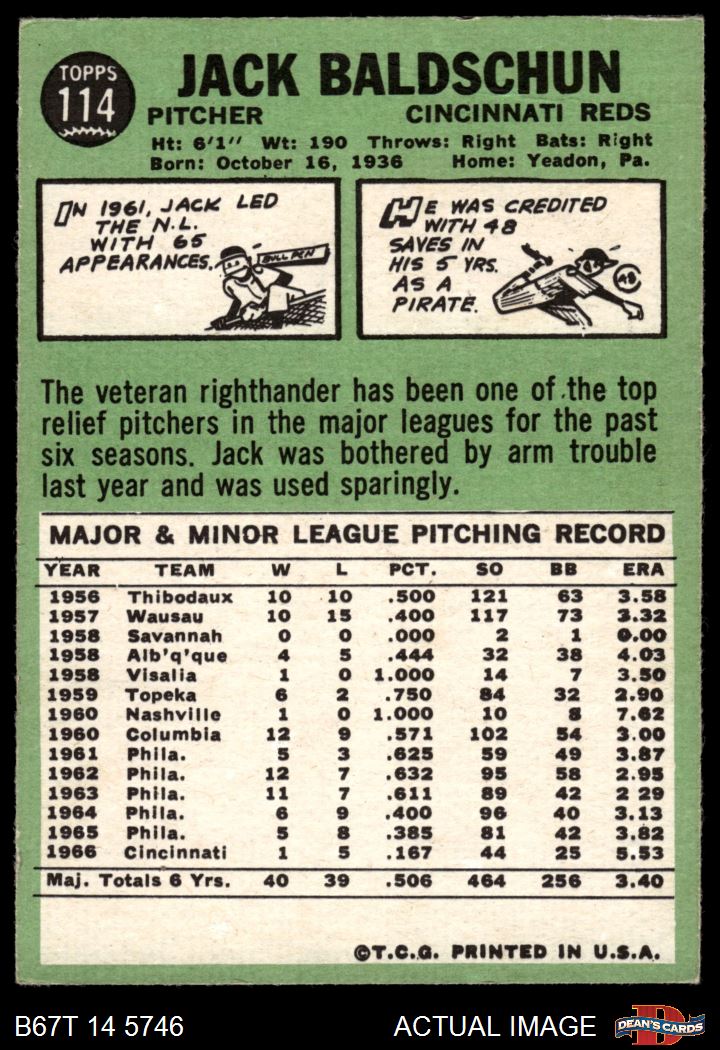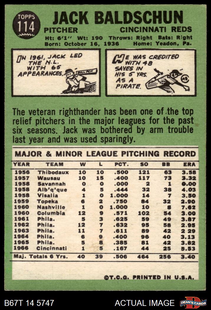 1967 Topps #114 Jack Baldschun 4 - VG/EX
