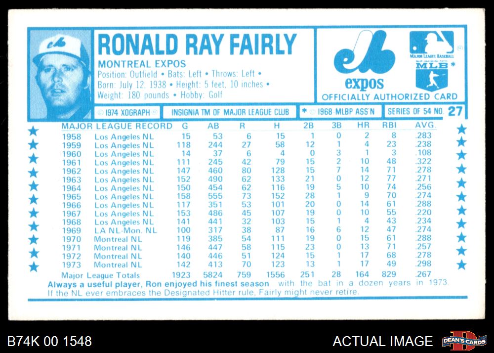 1974 Kellogg's #27 Ron Fairly 8 - NM/MT