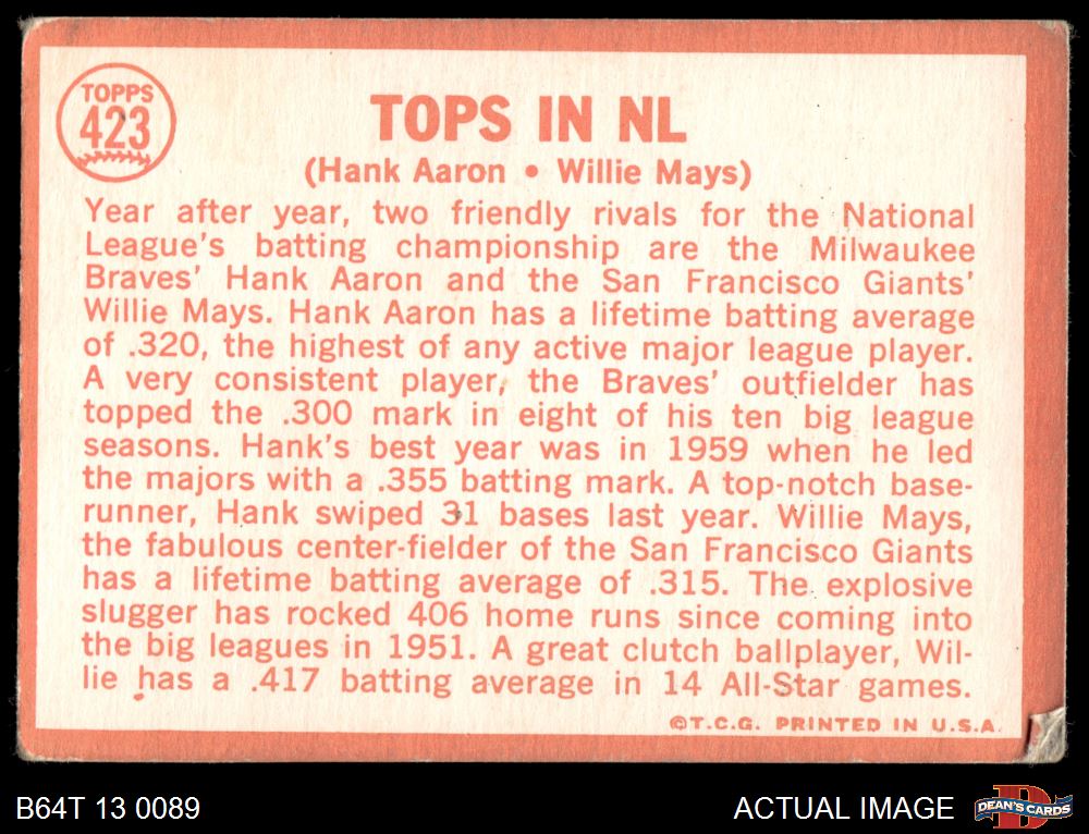 1964 Topps #423 - Willie Mays / Hank Aaron Tops in NL 2 - GOOD