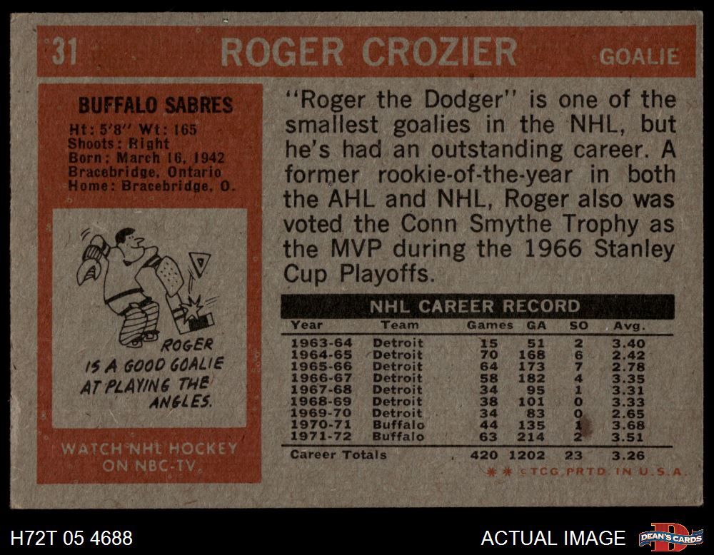 1972 Topps #31 Roger Crozier 4 - VG/EX