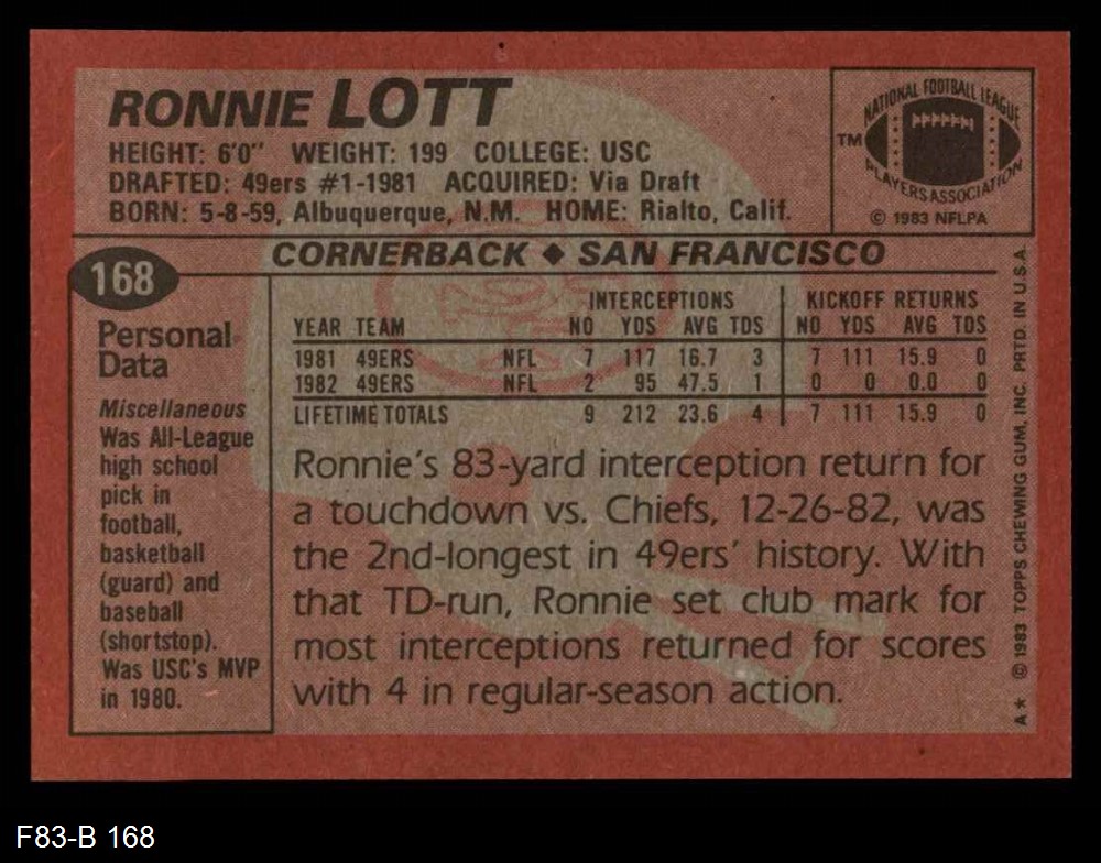 1983 Topps #168 Ronnie Lott