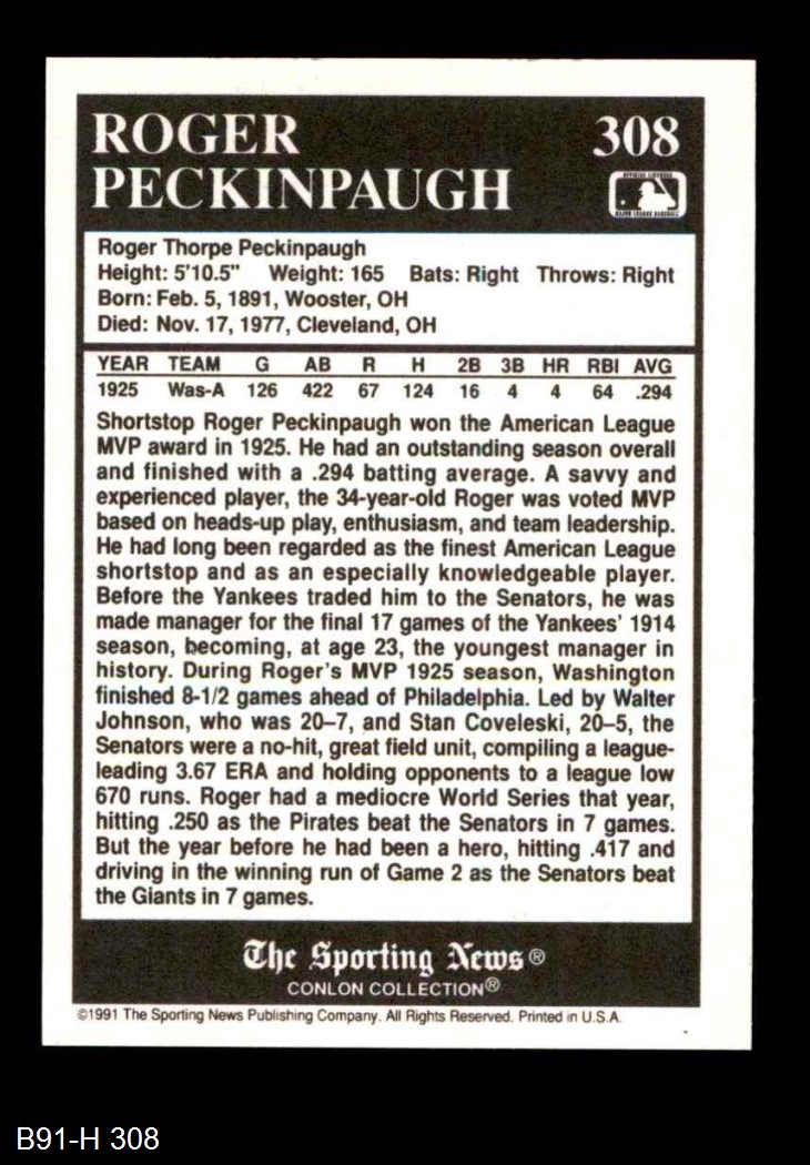1991 Conlon #308 - Roger Peckinpaugh Most Valuable Player 8 - NM/MT