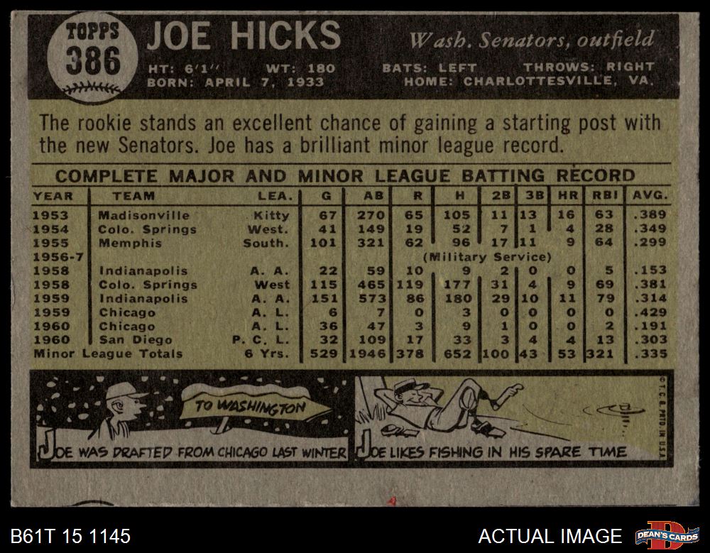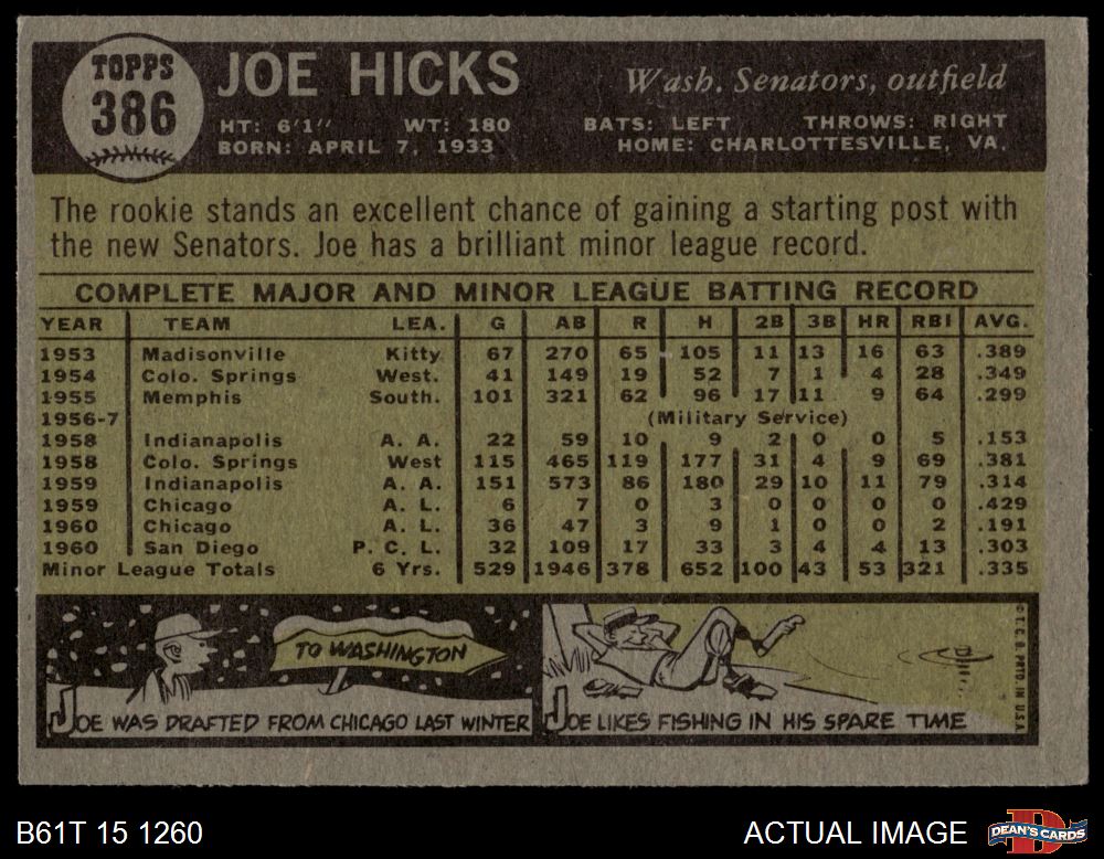 1961 Topps #386 Joe Hicks 4 - VG/EX