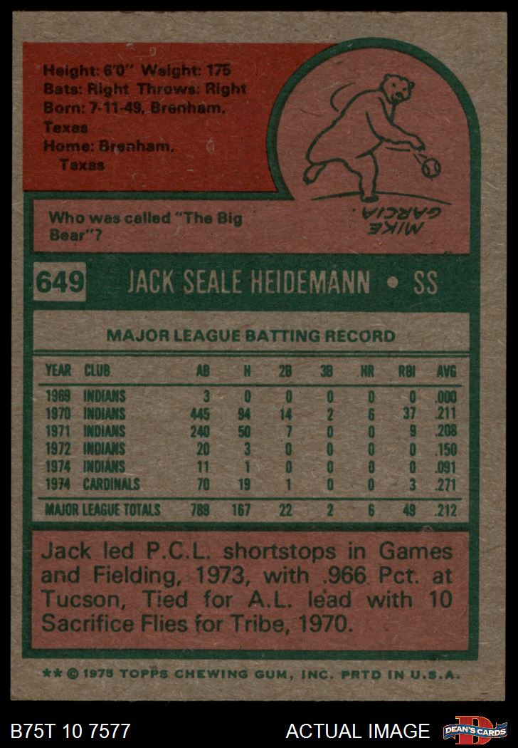 1975 Topps #649 Jack Heidemann 6 - EX/MT