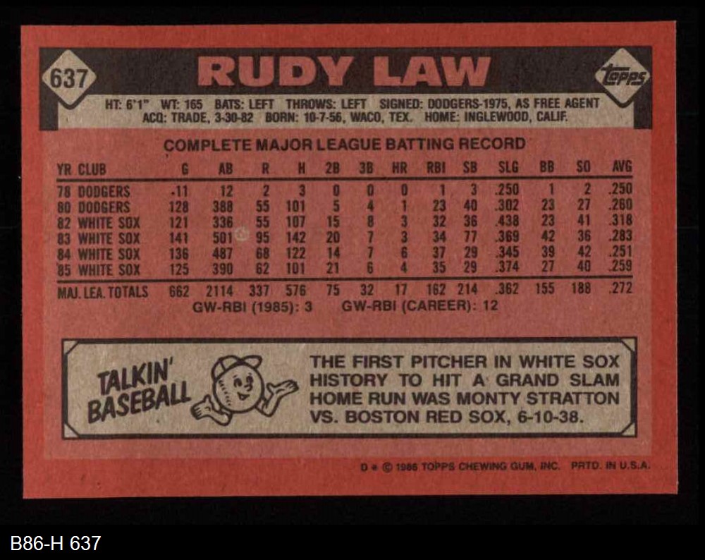 1986 Topps #637 Rudy Law 8 - NM/MT