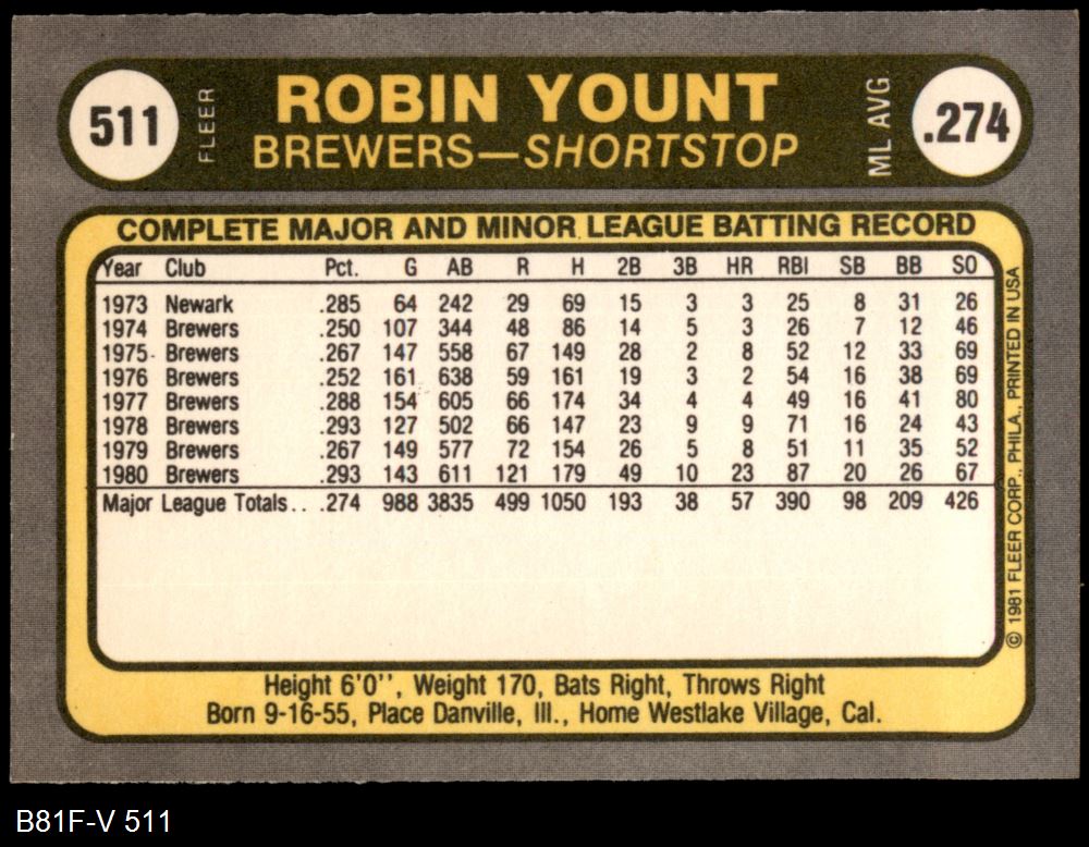 1981 Fleer #511 Robin Yount 8 - NM/MT