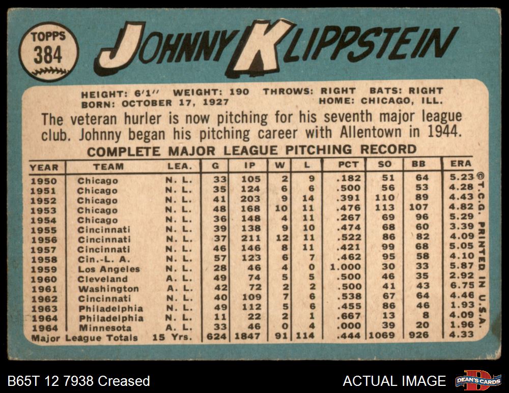 1965 Topps #384 Johnny Klippstein Front Thumbnail