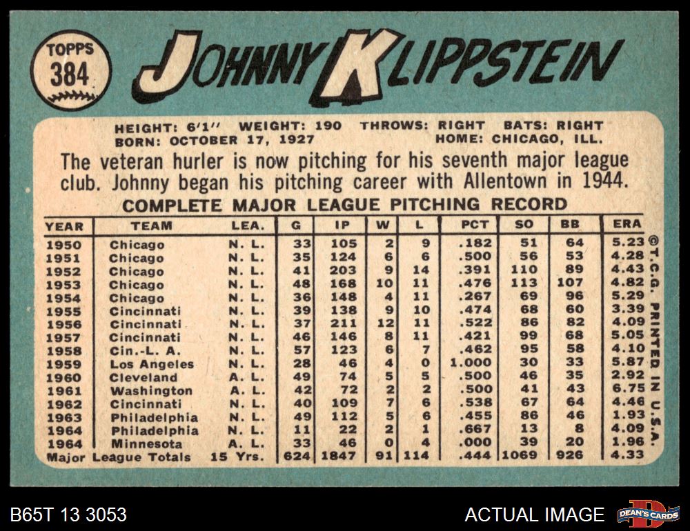 1965 Topps #384 Johnny Klippstein 7.5 - NM+