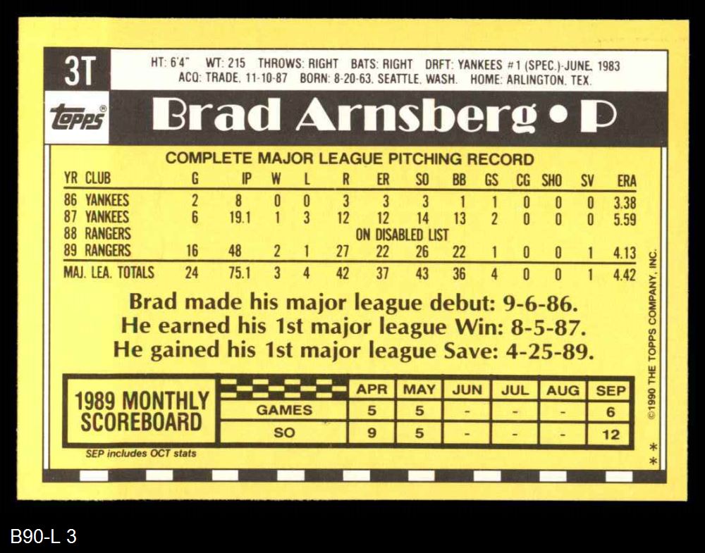 1990 Topps Traded #3 T Brad Arnsberg 8 - NM/MT