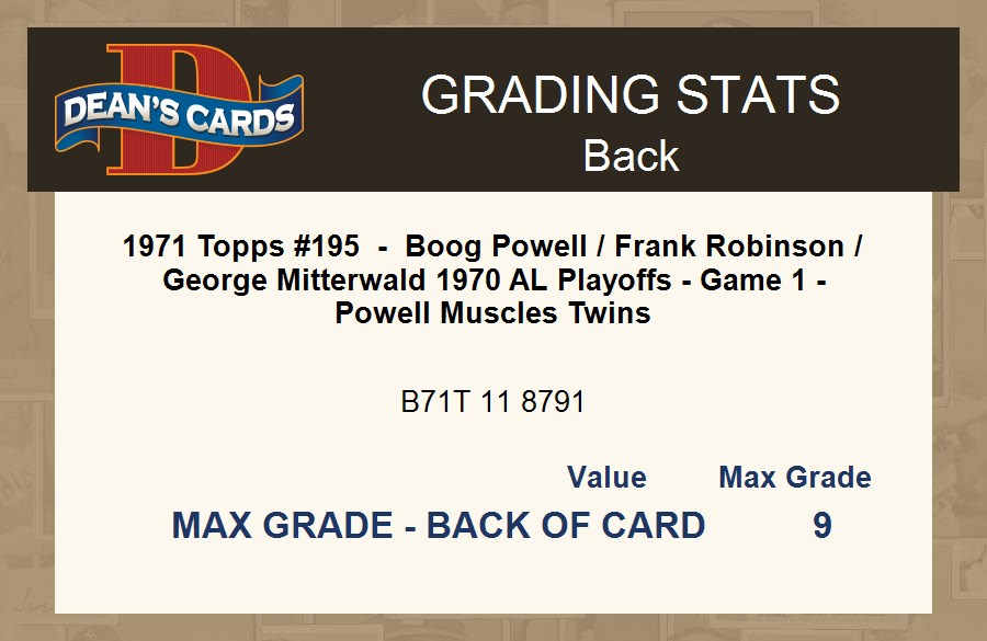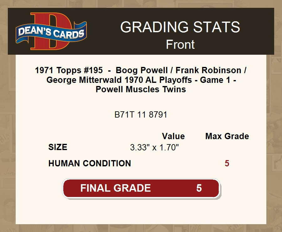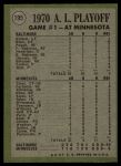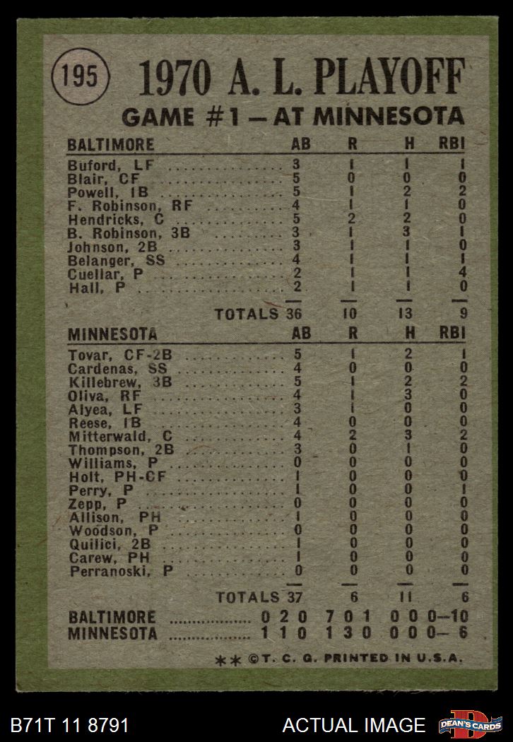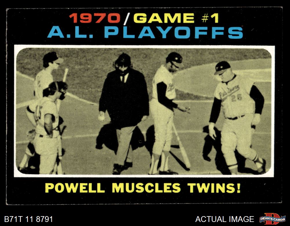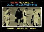 1971 Topps #195 - Boog Powell / Frank Robinson / George Mitterwald 1970 AL Playoffs - Game 1 - Powell Muscles Twins 5 - EX