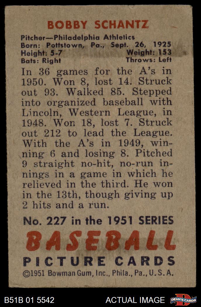 1951 Bowman #227 Last Name Schantz Bobby Shantz 2 - GOOD