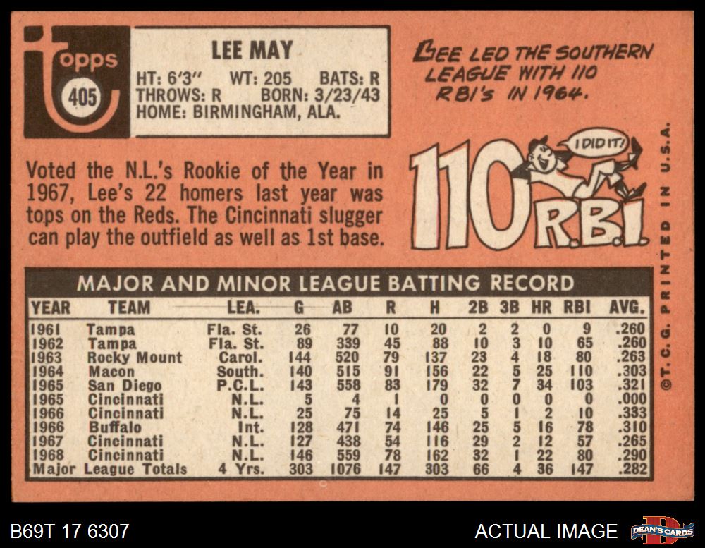 1969 Topps #405 Lee May 6 - EX/MT