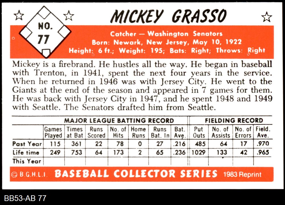 1953 Bowman REPRINT #77 Mickey Grasso 8 - NM/MT