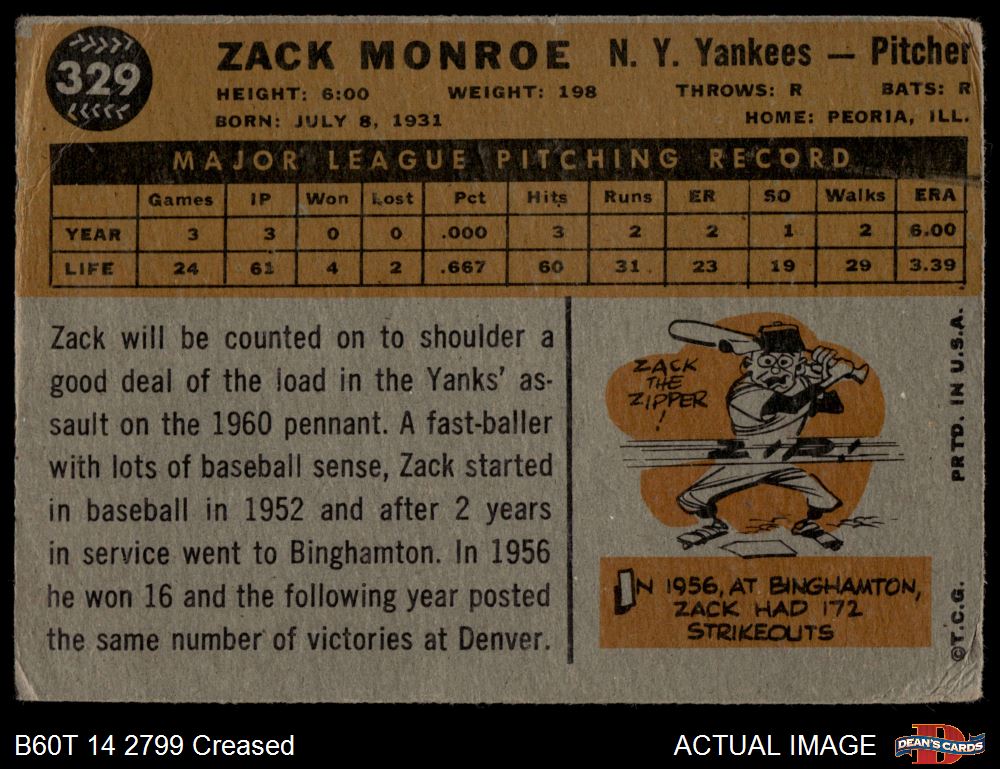 1960 Topps #329 Zack Monroe 1.5 - FAIR