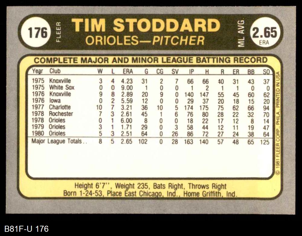 1981 Fleer #176 Tim Stoddard 8 - NM/MT