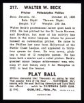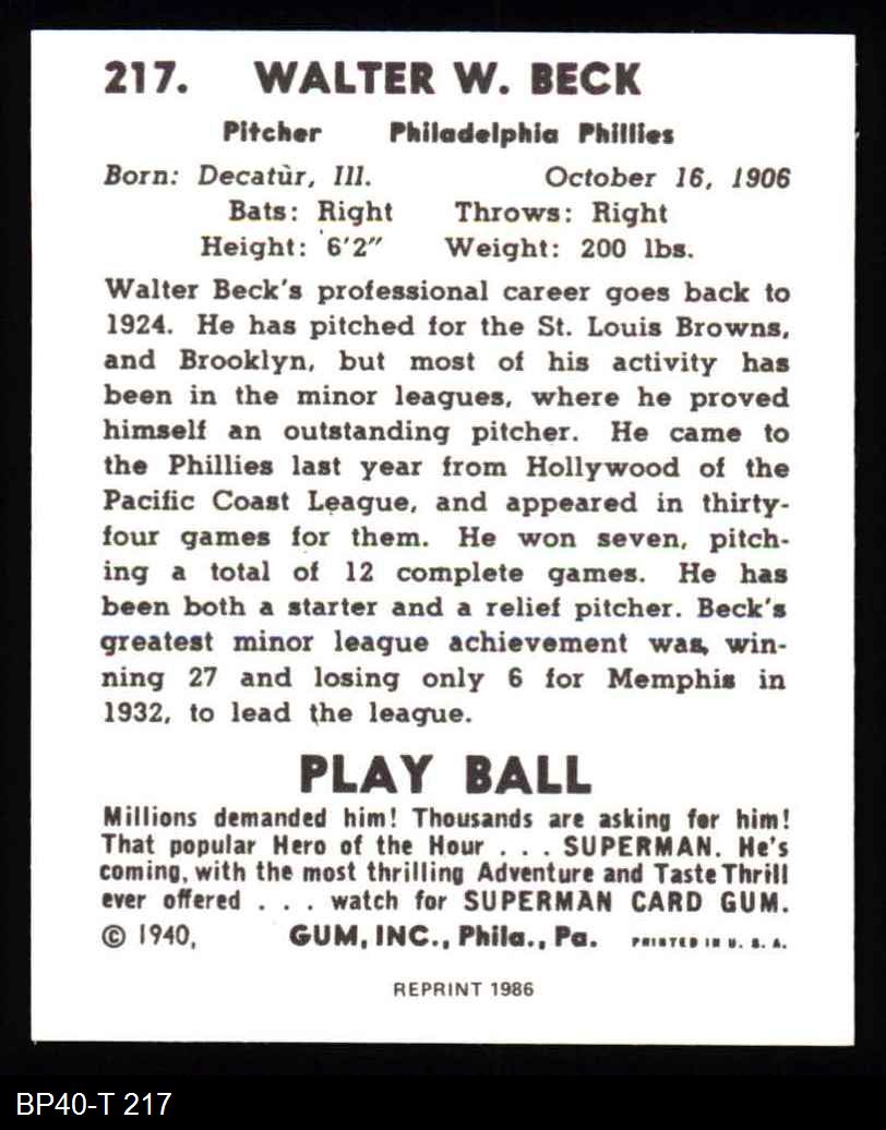 1940 Play Ball Reprint #217 Walter Beck 8 - NM/MT