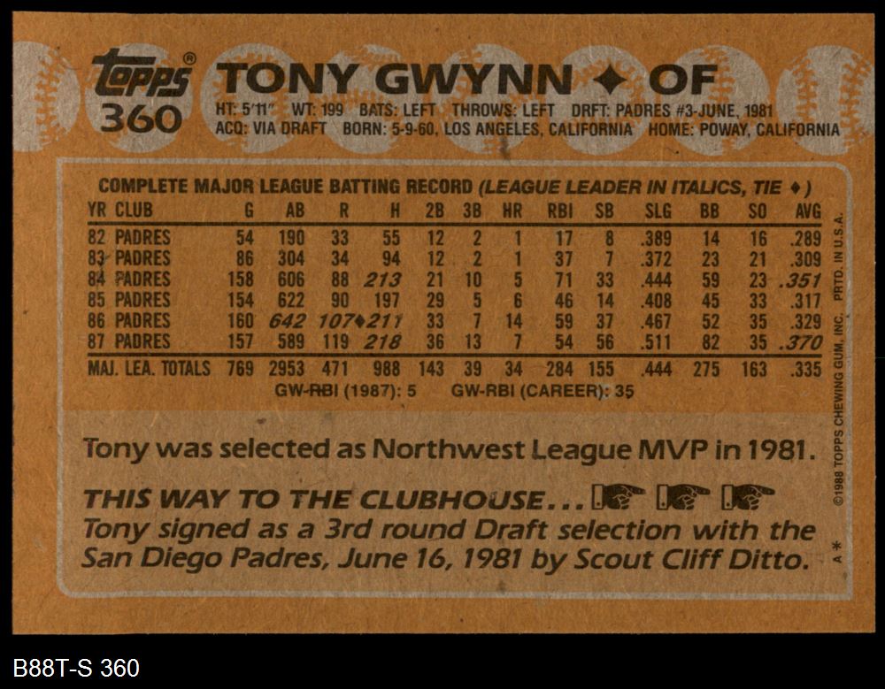 1988 Topps #360 Tony Gwynn
