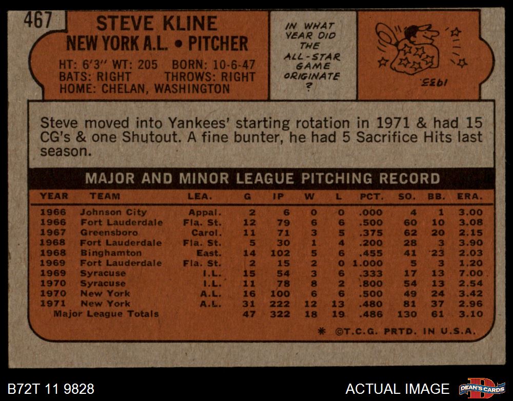 1972 Topps #467 Steve Kline 3 - VG
