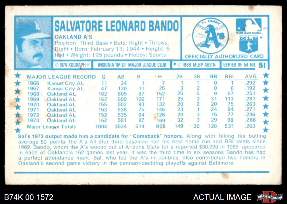1974 Kellogg's #51 Sal Bando 2 - GOOD