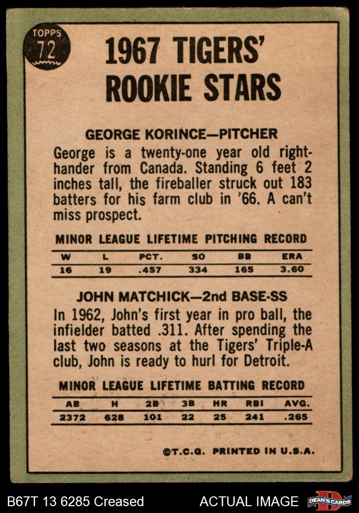 1967 Topps #72 Korince Photo is actually of James Murray Brown - John Matchick / George Korince Tigers Rookies 2 - GOOD