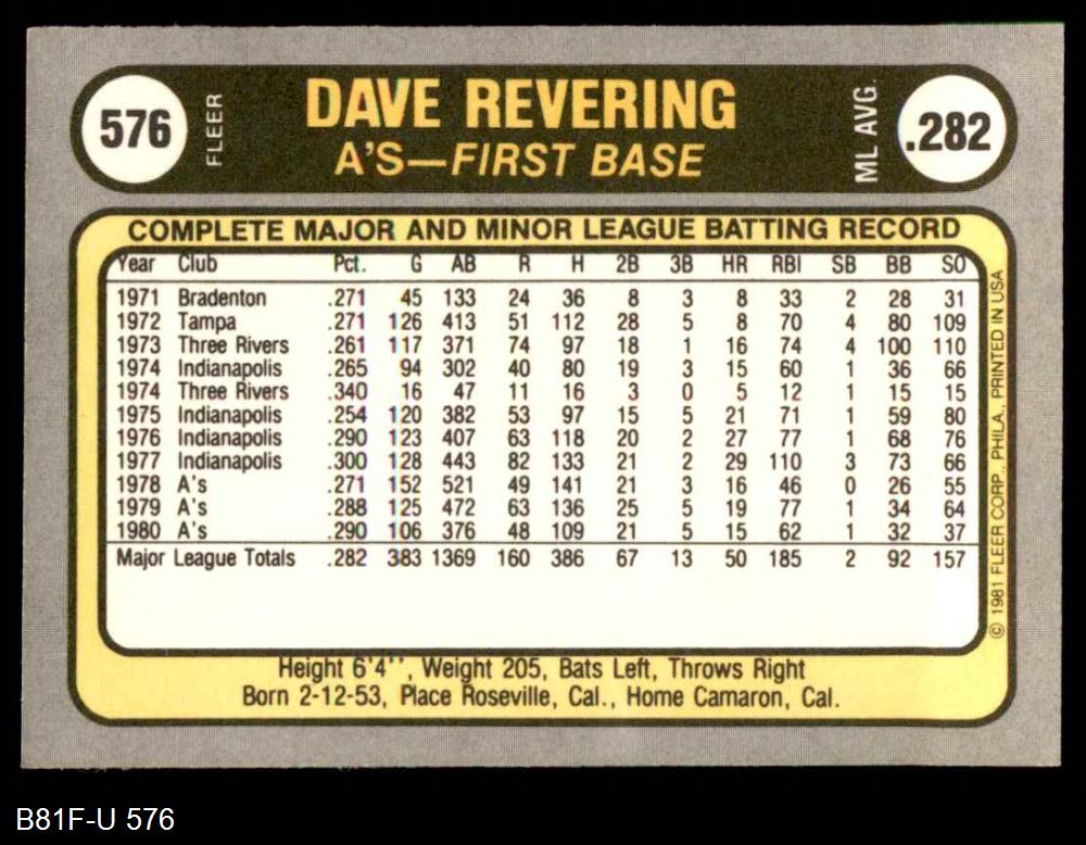 1981 Fleer #576 Dave Revering