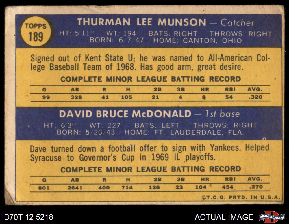 1970 Topps #189 - Thurman Munson / Dave McDonald Yankees Rookies 1.5 - FAIR