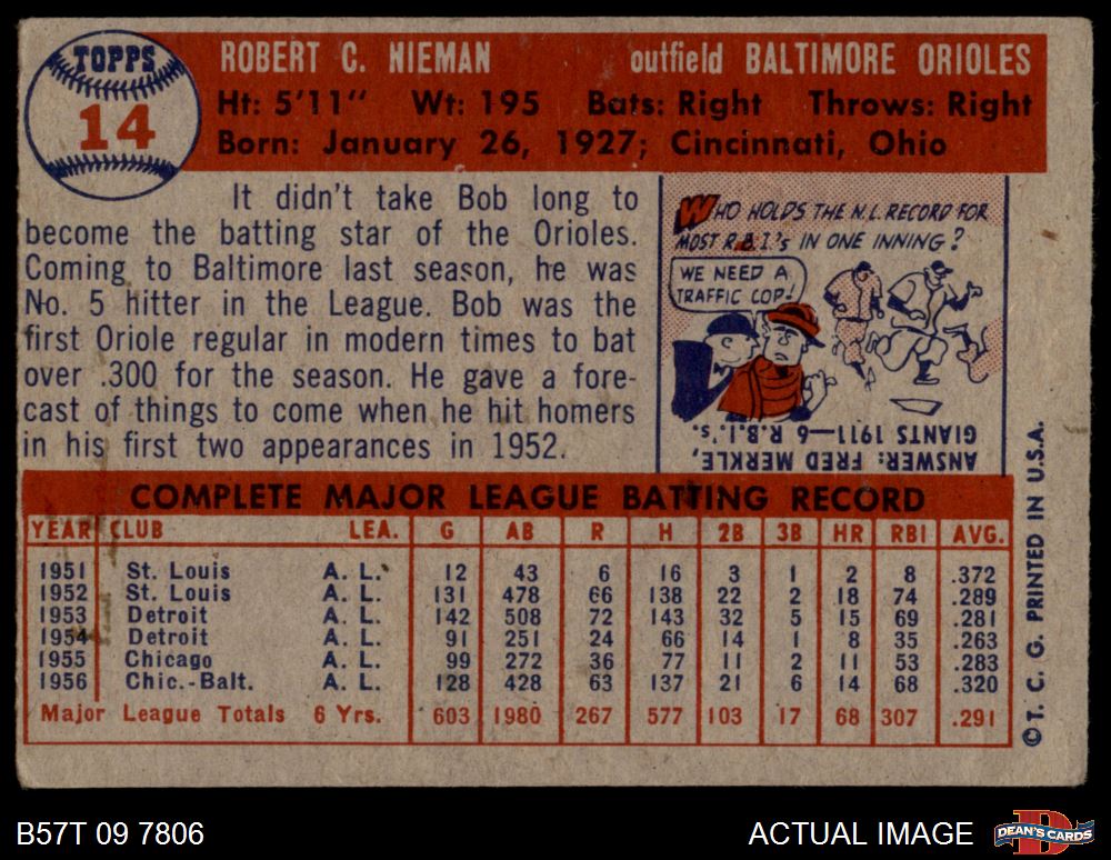 1957 Topps #14 Bob Nieman 1 - POOR