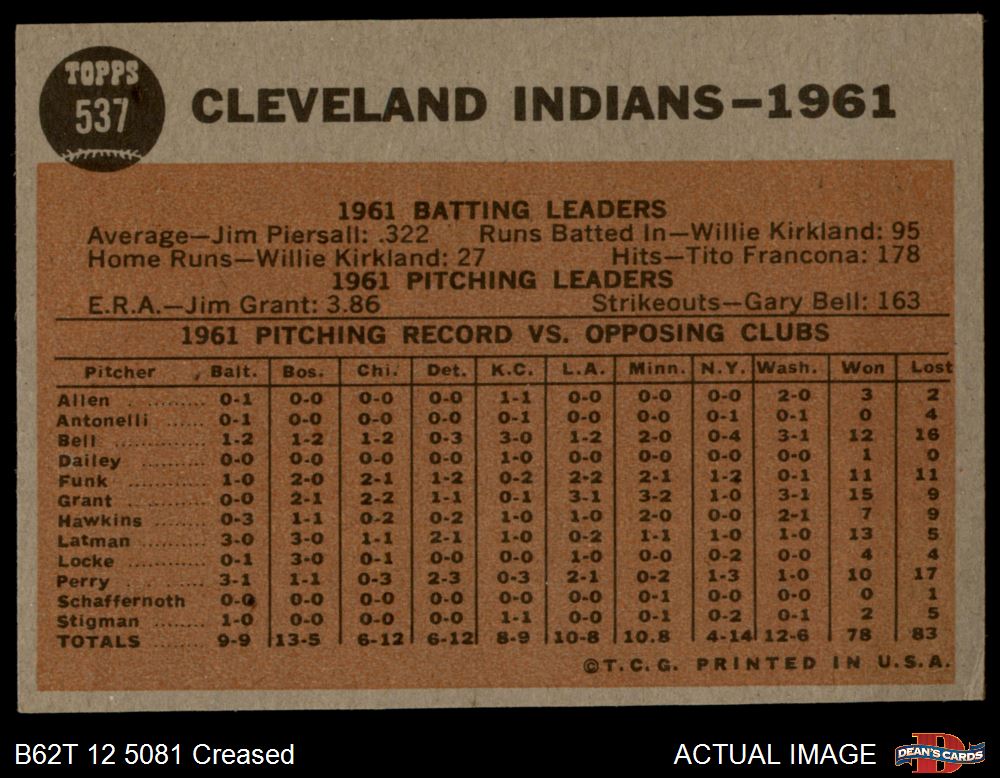 1962 Topps #537 Indians Team 2 - GOOD