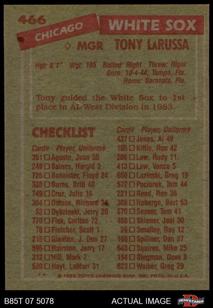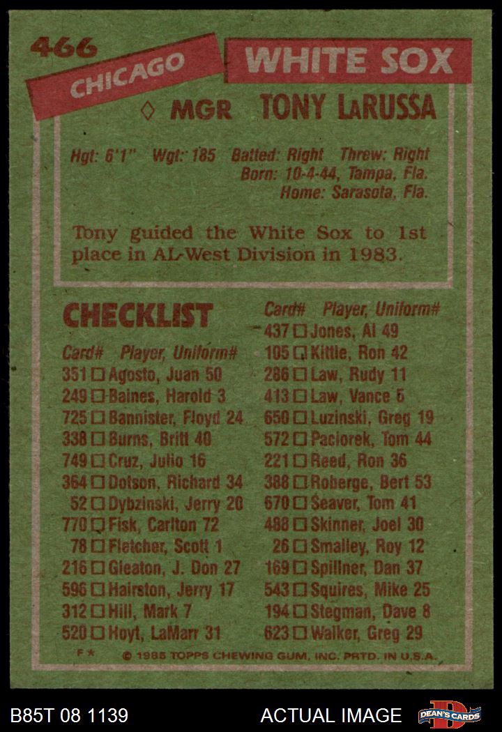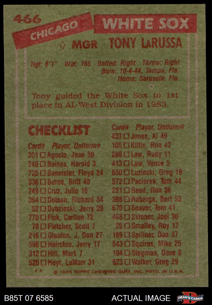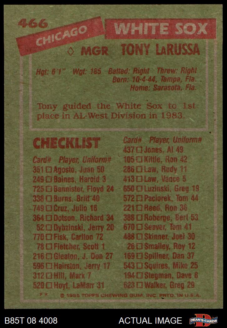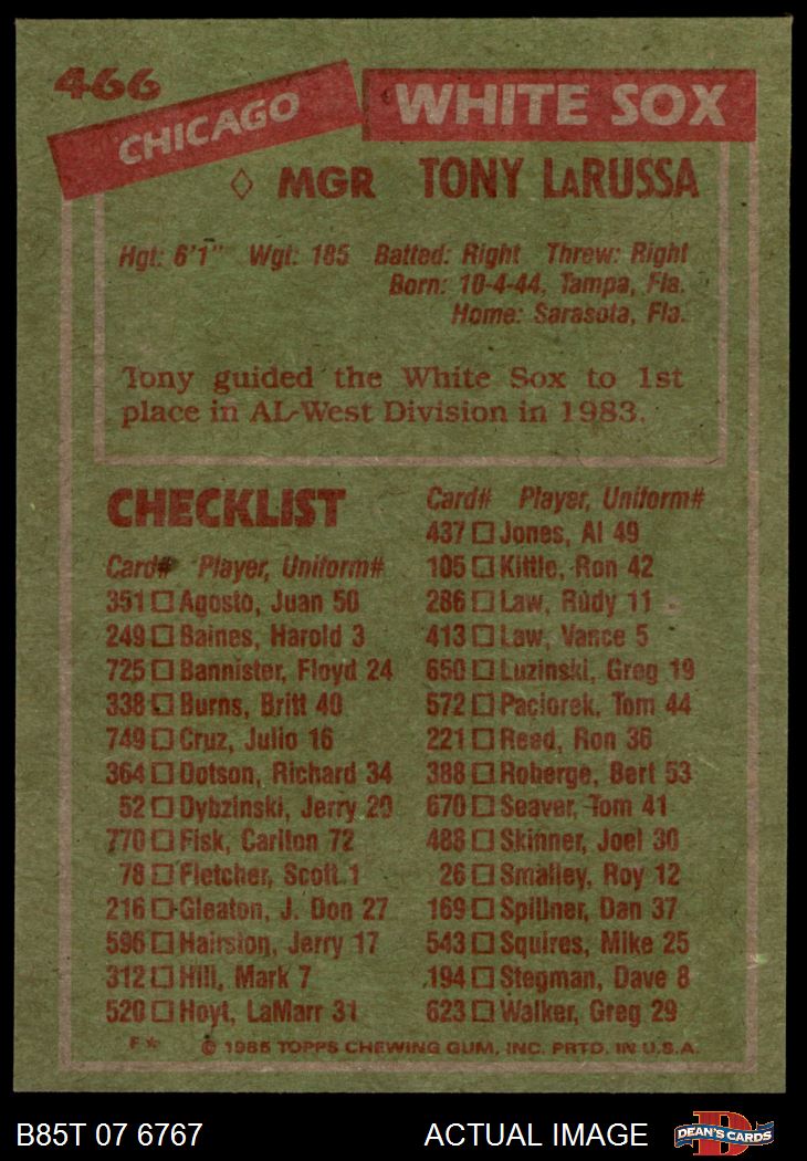 1985 Topps Baseball Cards (11,340 available)1985 Topps White Sox (549 available)
