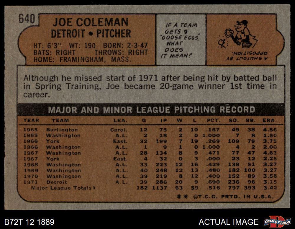 1972 Topps #640 Joe Coleman 4 - VG/EX