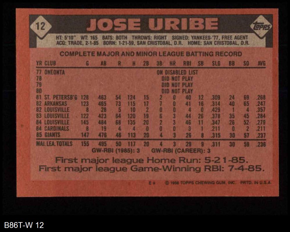 1986 Topps #12 Jose Uribe 8 - NM/MT