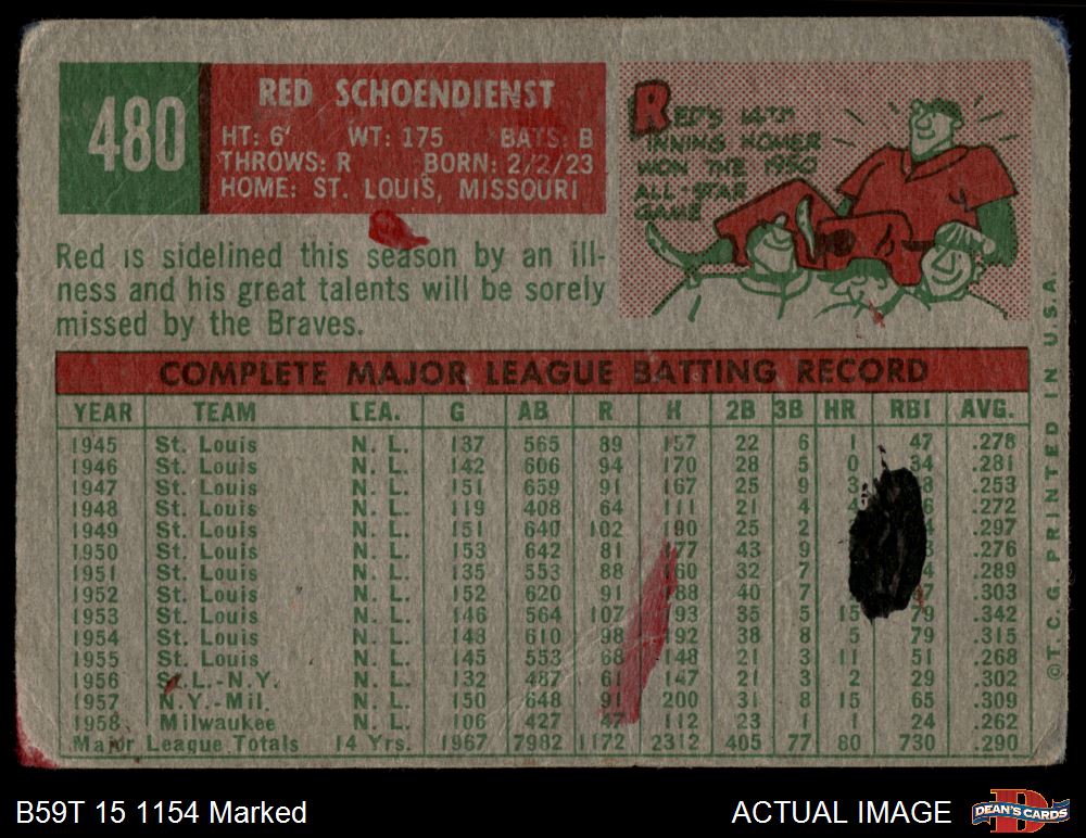 1959 Topps #480 Red Schoendienst AUTHENTIC