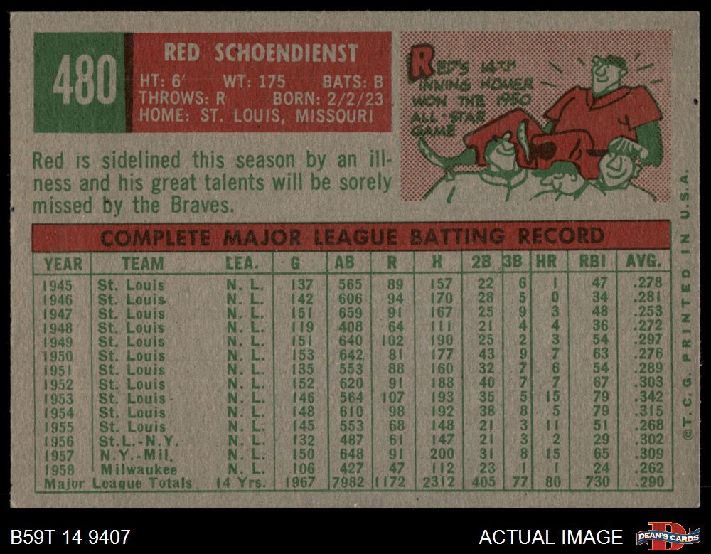 1959 Topps #480 Red Schoendienst 6 - EX/MT