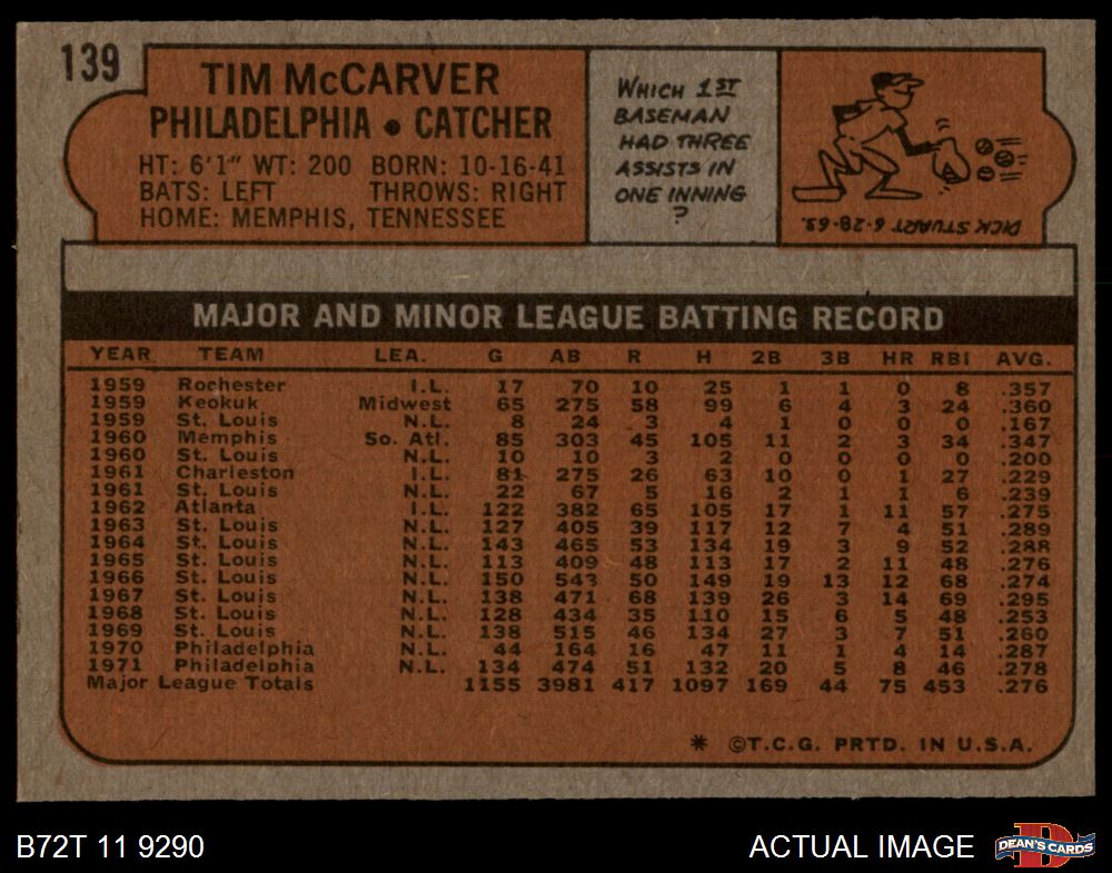 1972 Topps #139 Tim McCarver 6 - EX/MT