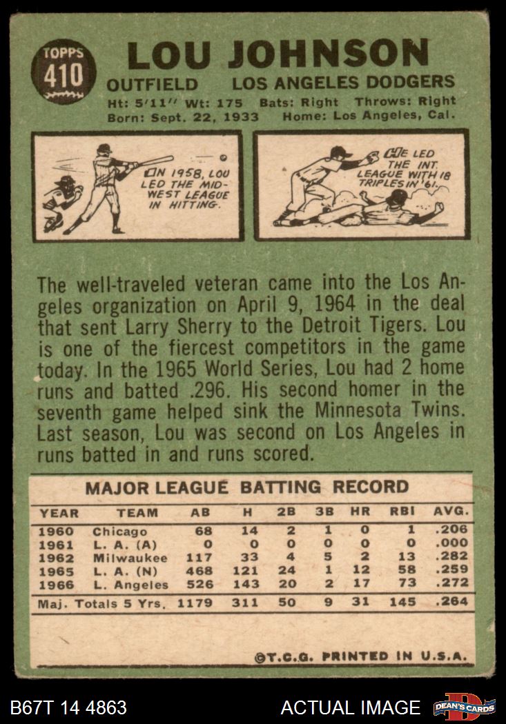 1967 Topps #410 Lou Johnson 1.5 - FAIR