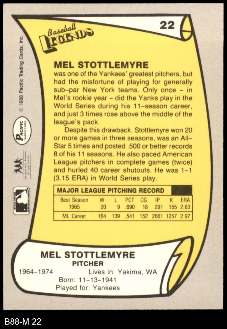 1988 Pacific Legends #22 COR Mel Stottlemyre 8 - NM/MT
